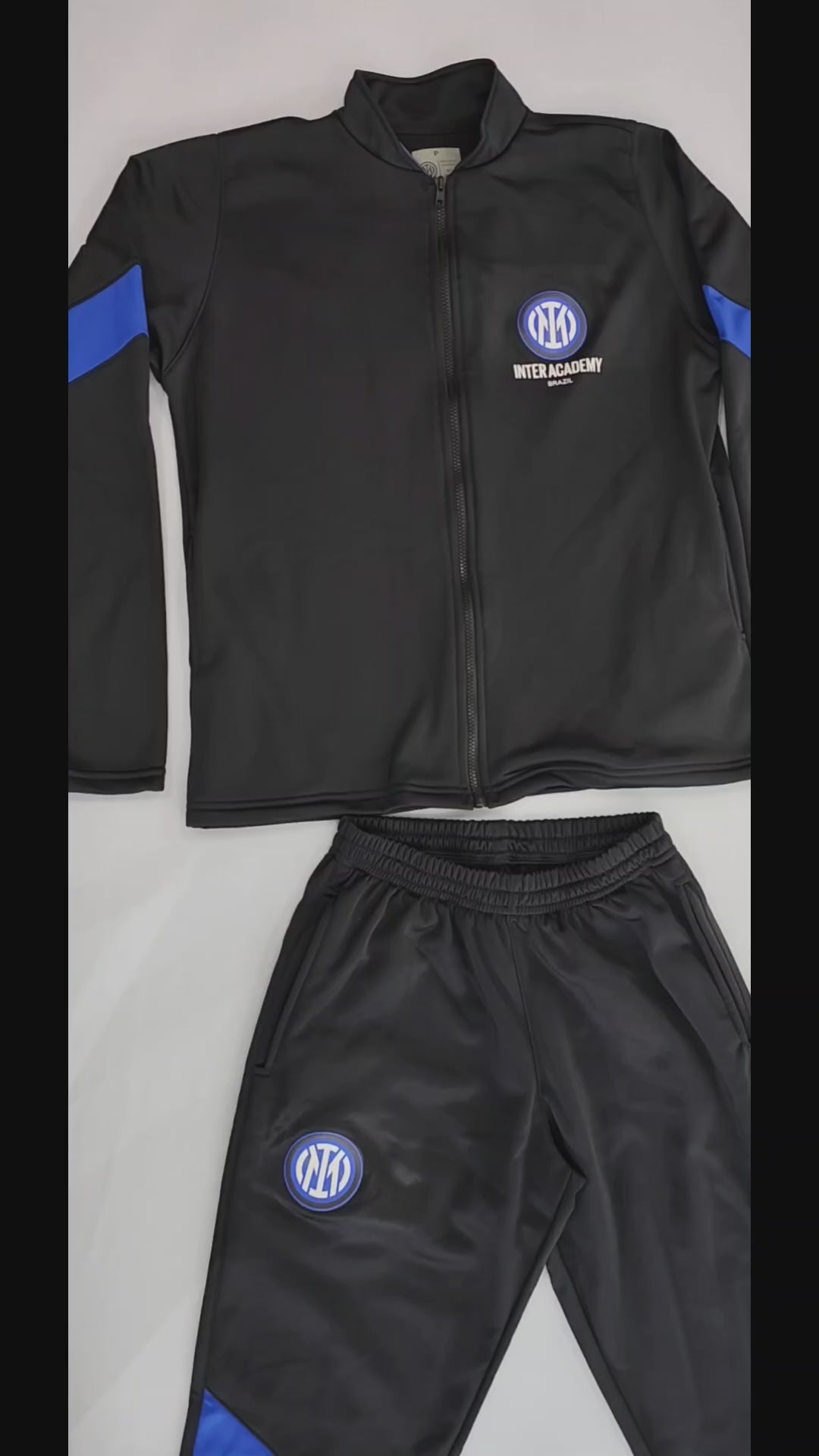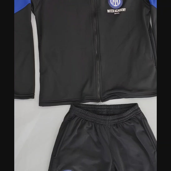 A blusa possui zíper frontal inteiro, facilitando vestir e permitindo ventilação quando necessário. O design moderno em preto com detalhes em azul nas mangas traz visual marcante e alinhado ao padrão oficial da Inter Academy.